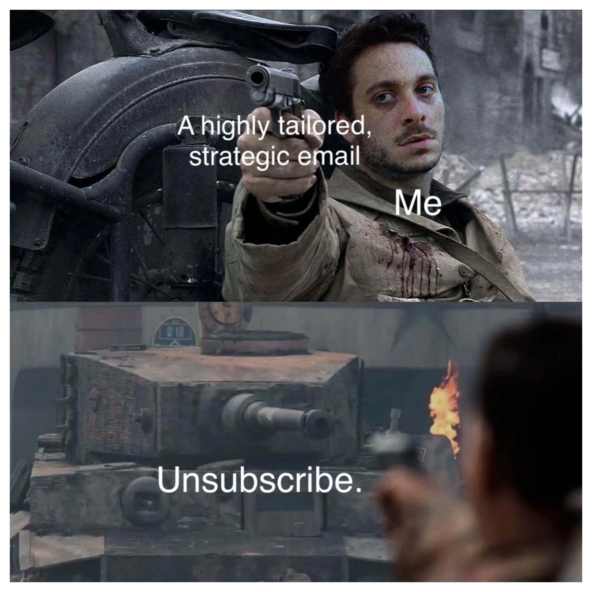 After 45 minutes tailoring an email to match the industry, company, role, and LinkedIn interests of your prospect, 99% of the time they're just a devil-wench who will stop at nothing to prevent you from hitting quota. Shit happens. #UnsolicitedEmails #NoticedYouDownloadedOurWhitePaper #ButYouHaventEvenHeardMySmallTalk #WaitTilICallToFollowUp